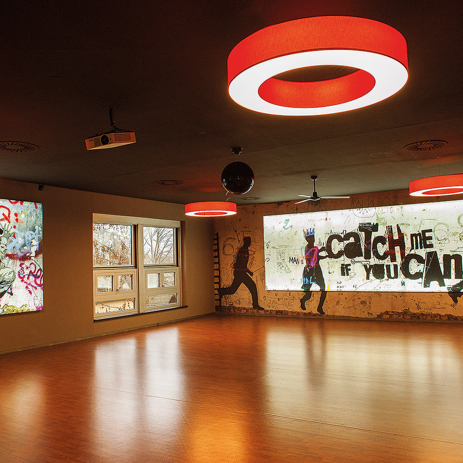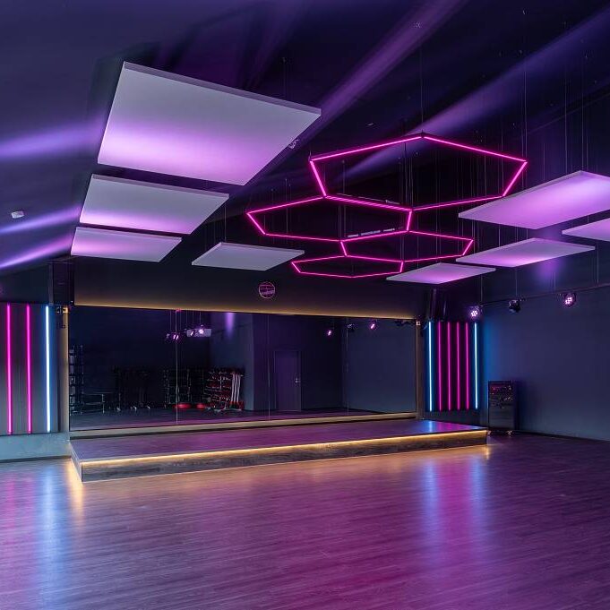 Der Light Circle ist eine kostengünstige Möglichkeit, Lichtakzente im Studio zu setzen. Light Circles haben eine sehr intensive Leuchtintensität und sind in verschiedenen Durchmessern erhältlich. Sie können zwischen Stand-Alone-Lichteffekt mit Weißlicht oder mit RGB-Farblicht wählen. Ebenso ist es möglich die Leuchtkreise u. a. über die Lichtsteuerung mit Farbwechsel im Kursraum einzusetzen. Die Anbringung an Wänden oder unter der Decke ist möglich.
